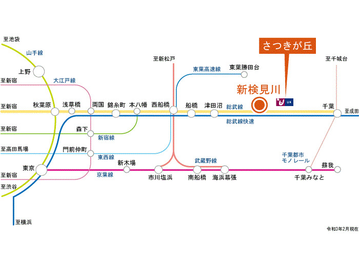 JR総武線 『 稲毛 Sta. 』 20 min by bus 『さつきが丘第二』 Bus Stop 2 min walk 京成千葉線 『 検見川 Sta. 』 41 min walk |