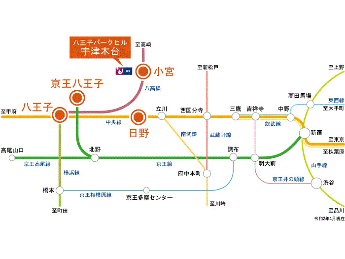 JR中央線 『 八王子 Sta. 』 22 min by bus 『宇津木台中央』 Bus Stop 3 min walk 京王線 『 京王八王子 Sta. 』 22 min by bus 『宇津木台中央』 Bus Stop 3 min walk JR八高線 『 小宮 Sta. 』 11 min walk |