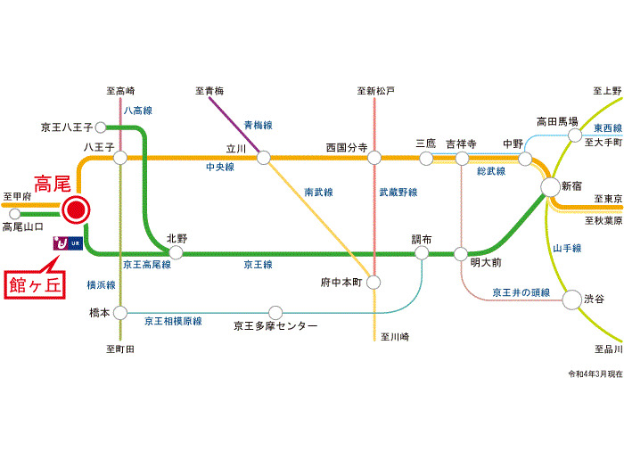 JR中央線 『 高尾 Sta. 』 7 min by bus 『館中学校前』 Bus Stop 1 min walk JR中央線 『 高尾 Sta. 』 29 min walk |